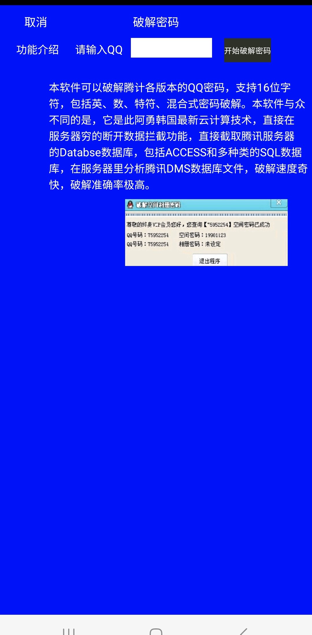 使用的教程也很简单,大家使用使用安卓手机下载安装激活后,只需要输入QQ号,然后点击破解,即可得到出来现在的QQ密码